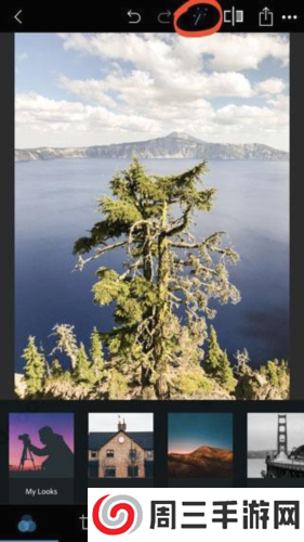 在屏幕顶部,你将看到一个蓝色的自动增强工具(魔法棒图标)。此工具应用自动灯光和颜色调整,以尝试改善照片。
