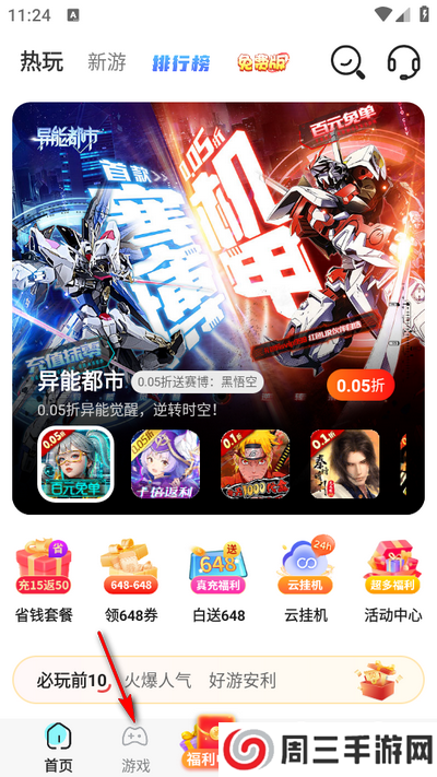 1.打开软件进入首页,点击下方游戏