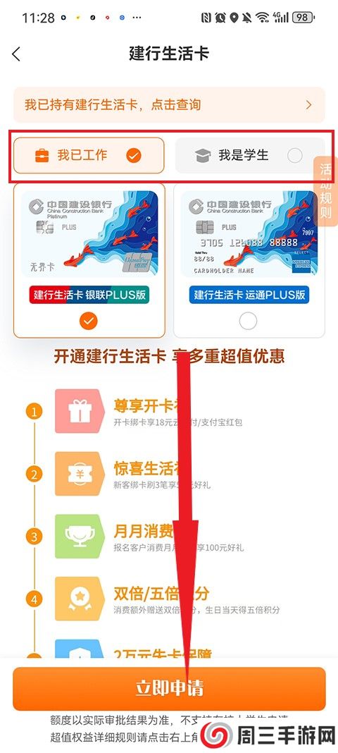 3、之后选择“已工作”或者“学生”,再点击下方的立即申请。