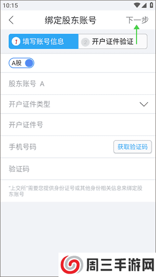 5、在进入的新页面中,按信息提示依次输入个人信息,并获取验证码,等系统通过后,就可点击“下一步”,进入开户证件验证环节,完成这两步后系统将会完成绑定股东账号流程