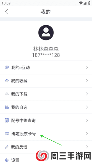 3、在进入“我的”页面中,点击“绑定股东卡号”