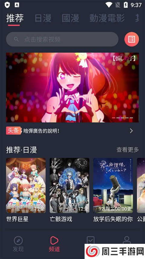 1、打开软件之后会默认进入到【频道】板块,选择你想要观看的动漫并点击进入到视频播放界面。