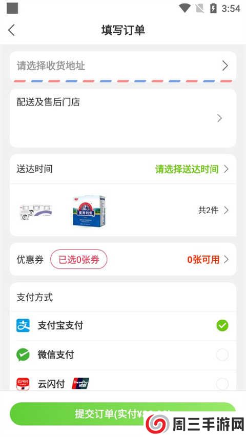 5、填写收获地址和配送以及售后门店,提交订单后明天就可以收到商品了,每晚十点三十分前抢购即可哦。