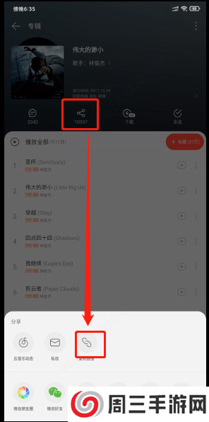 1.到想要下载的歌曲或专辑页面中点击“分享”——“复制链接”;