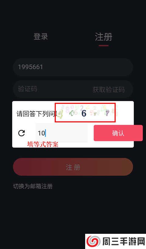 3、然后点击“获取验证码”,需要回答问题如下图,等式为4+6=?,验证码那里需要输入答案10。(遇到看不清楚的数字图案可以点击左侧的刷新按钮,重新获取等式)