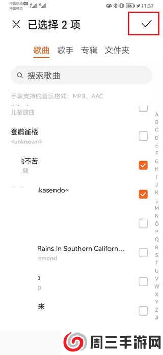 4、在添加音乐列表,勾选具体音乐后,点击右上角【√】确认即可。