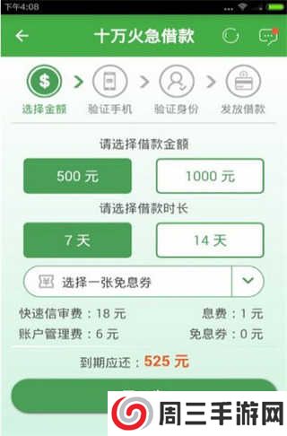 3、接下来就只需要四步,选择金额,验证手机,验证身份,发放借款。