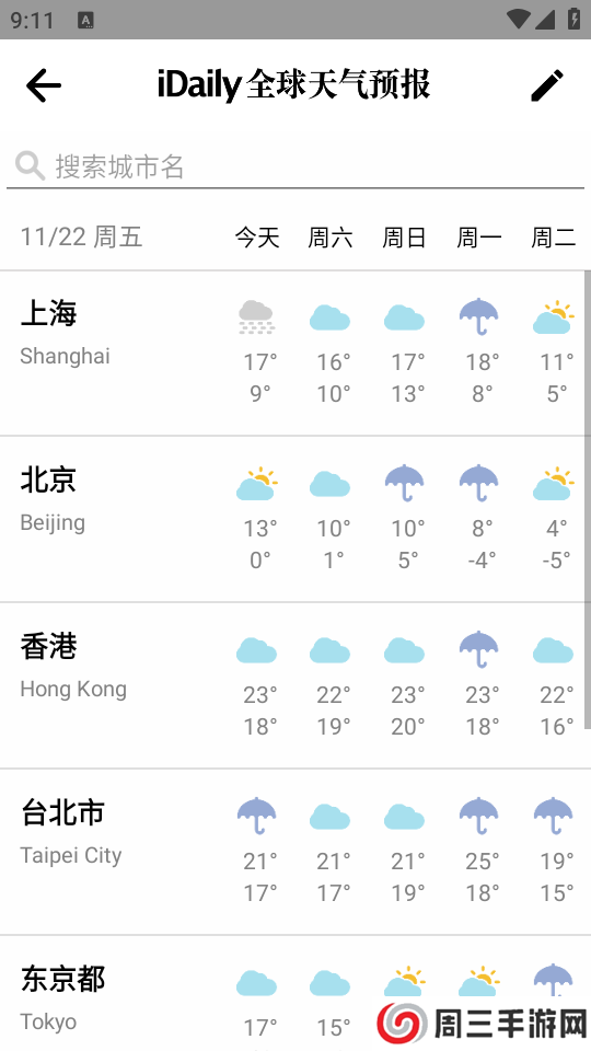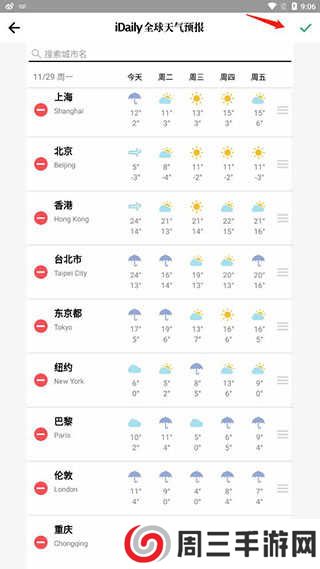 6.应用的右上角还配有天气预报功能,点开后可以看到世界各地首都的天气预报。