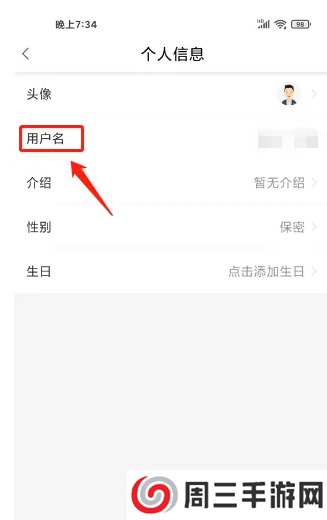 进入个人信息,点击(用户名)选项,如图标注所示。