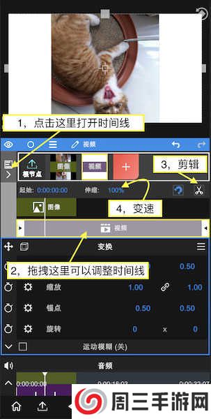 3、打开补帧功能后,还需要通过放慢视频速度来看到效果;