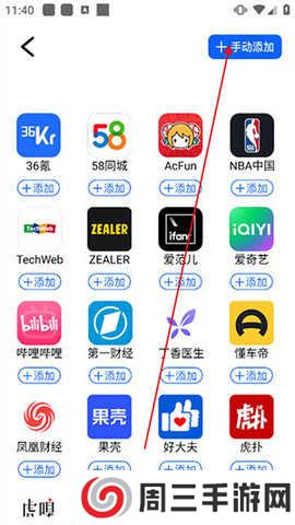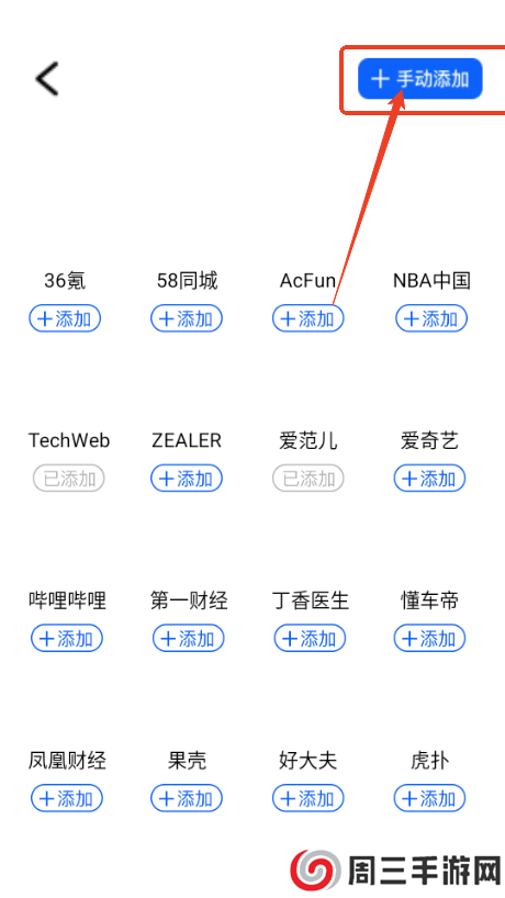 3.点击右上角【手动添加】,这里没有需要的网页可自己输入网址来添加,如下图所示;