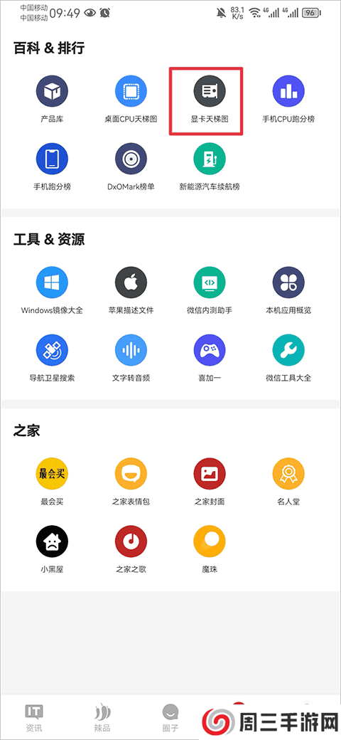 二、怎么看显卡排行榜1.在发现界面中为用户提供了百科排行、工具资源、之家三大类功能,在百科排行功能中点击显卡天梯图