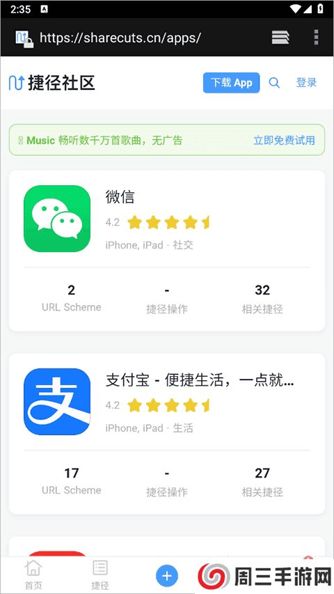 6、不知道URL Scheme 的链接可以在左上角的“捷径社区”中查找。也可以在搜索引擎搜索 App 名称 + URL Scheme 尝试寻找。