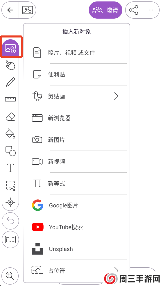 1.点击左边最上边一个按钮,可以插入新对象,不仅能插入照片,还可以插入视频、文件,便利贴自带的剪贴画以及网页等。