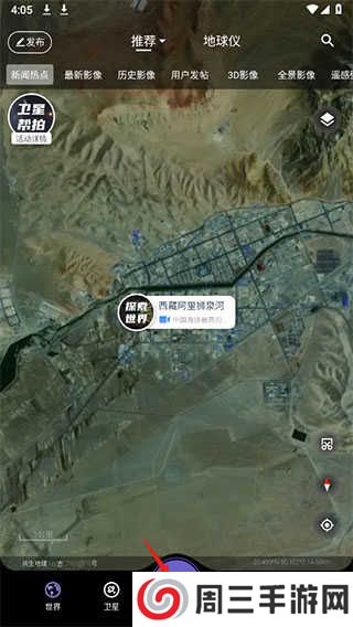 1、进入共生地球卫星地图app,长按中间小火箭即可刷新场景