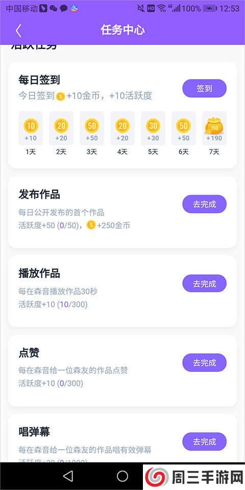 2、打开任务中心后,用户可以通过签到、发布作品、点赞等方式,完成对应任务获取金币,金币到了一定值时即可兑换钻石