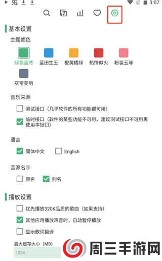 6、在设置界面就可以设置主题,设置音乐来源,设置列表随机播放、顺序播放