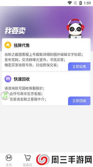 4、我要卖,用户可以选择挂牌代售和快速回收服务进行售卖自己的游戏账号。