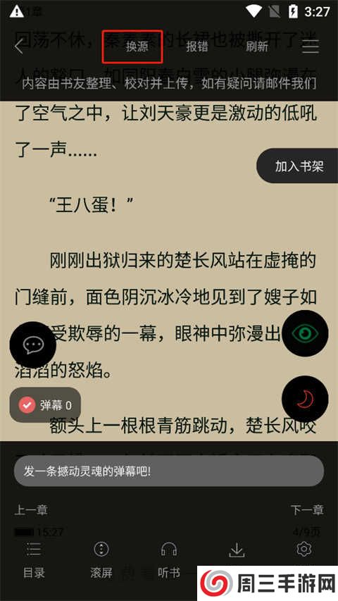 3、点击屏幕中间唤醒功能栏,点击右上角的换源功能。