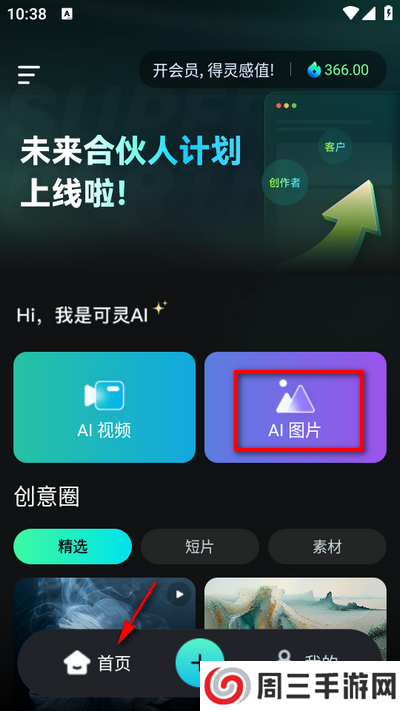 4.在【首页】可以看到AI视频以及AI图片功能,可根据需要选择对应的功能