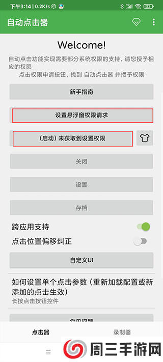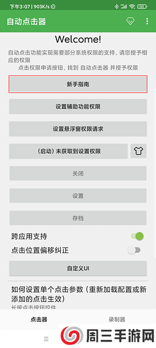 1、打开在3322下载的“自动连点器”,在首页这里有“新手指南”,可以查看使用指引;使用时首先要点击“设置辅助功能权限”。