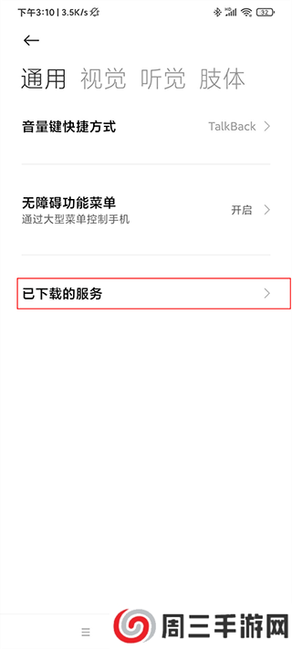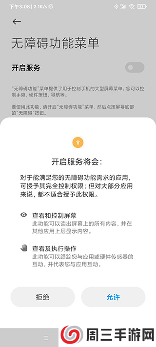2、点击“辅助功能权限”后,找到“无障碍功能菜单”,是默认关闭的,需要开启;