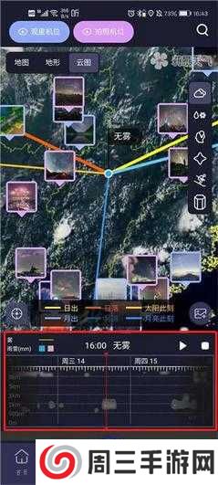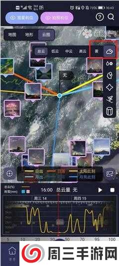 2、在地图页面中,将地图切换成云图,这样就可以查看到周边的云量分布状况,并且可以查看到各个时段的云量和云层高度等数据
