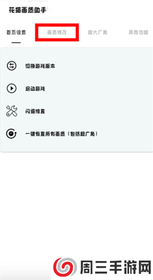 1.在本站下载并花猫画质助手,在软件的首页设置玩家们可以使用切换游戏版本、启动游戏、闪退修复、一键恢复所有画质等功能。