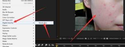 3、打开特效面版 ,找到Beauty Box 插件,把它放入素材的控制面版。可以看到只要把它放进去就可以看到以经有光滑的效果了。