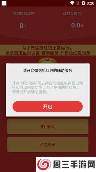 1、在本站下载安装自动抢红包软件(免费),运行软件,点击开启微信抢红包的辅助服务;