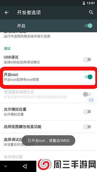 4、找到root开关,即可开启或关闭,根据提示重启VMOS。