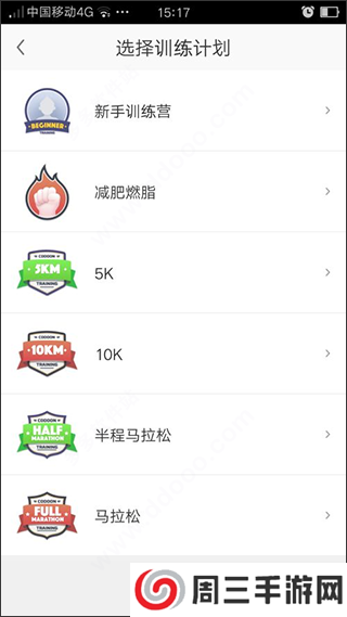 2、登录进咕咚的主界面后,我们会看到多种多样的选项,但是我们并不要着急地去点开它们,要一步一步地去设置才能更好的完成我们锻炼的定制,首先我们来到“运动”选项这里,划到第二页,进行训练计划的制定,一共有六种训练强度,分别是新手训练营、减肥燃脂等逐步递增,我们需选择适宜自身情况的情况进行参与,并设定参与的时间。