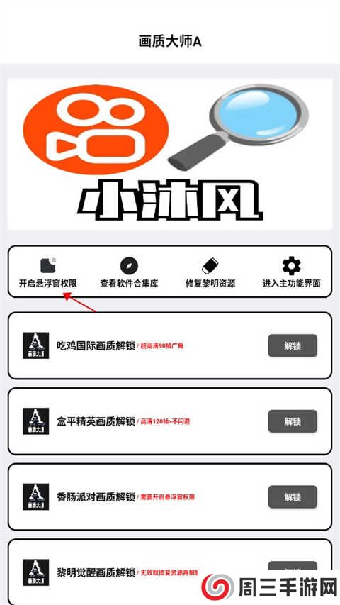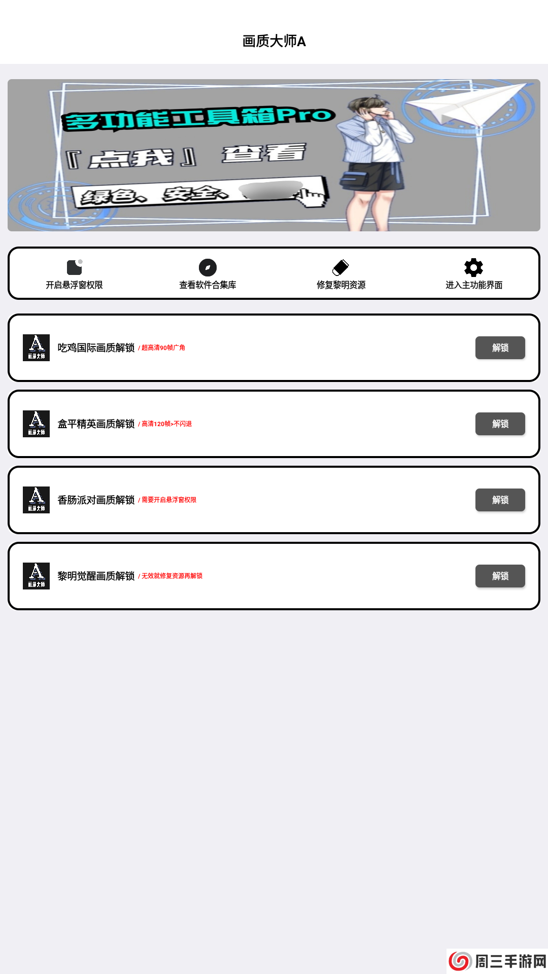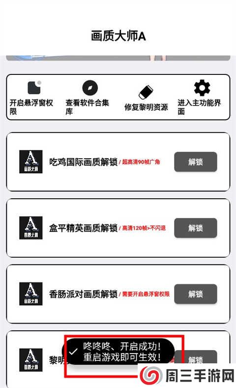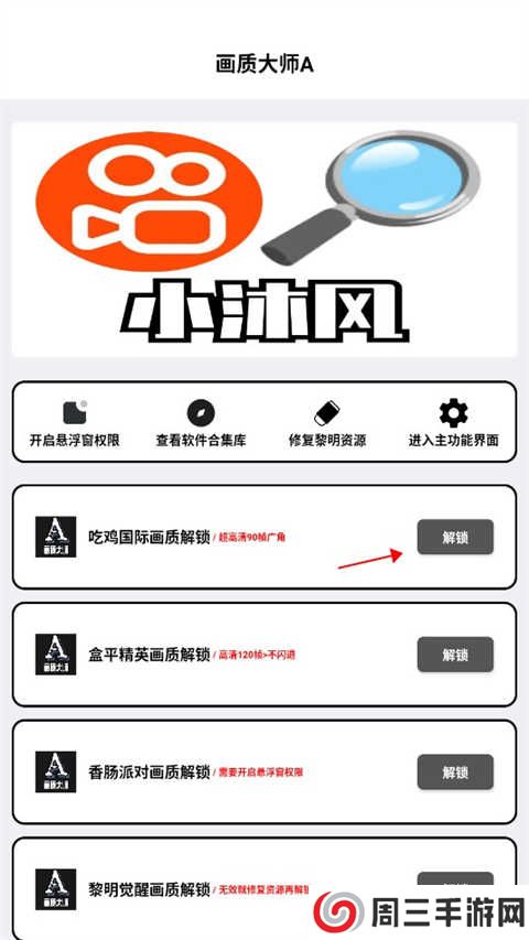 1、进入画质大师A软件之后,大家可以选择自己需要优化画质的游戏,选择好之后就可以点击旁边的“解锁”;