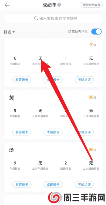 APP端:首页--学情分析--整体概况--点击查看成绩单--选择学生--点击查看答题卡