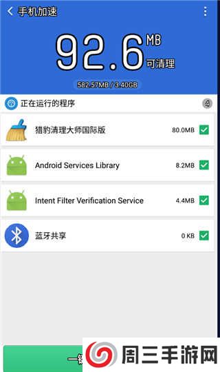3、进入该页面之后,点击一键清理即可加速手机的运行;
