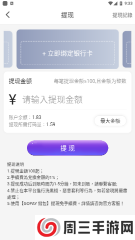 3、点击绑定银行卡,绑定你要提现到的银行卡,然后输入想要提现的金额,点击提现即可。
