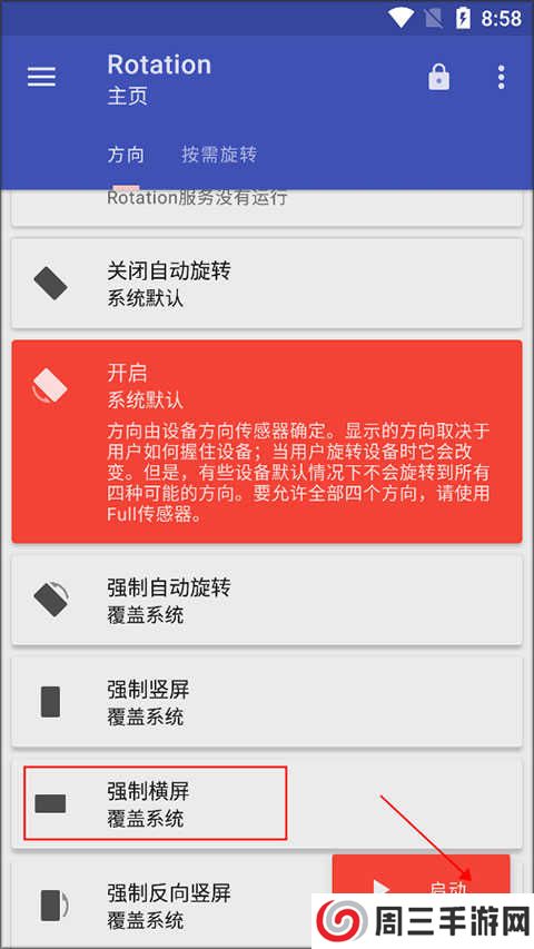 4、比如你要利用Rotation软件进行强制横屏,那么点击下“强制横屏”,再点击“启动”。