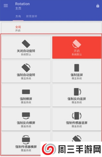 3、然后进入软件就能看到屏幕方向设置,目前这里是默认屏幕方向,可根据自己的需求来选择进行强制横屏或竖屏。