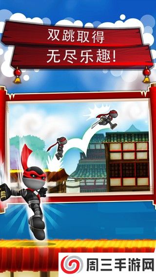 2. 操作方式:玩家通过滑动屏幕来控制忍者的移动方向和跳跃力度,双击屏幕可使忍者进行二段跳。