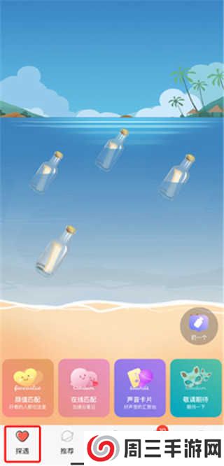 1、探遇页面:可以捞到别人的漂流瓶,也可以扔出自己的漂流瓶;
