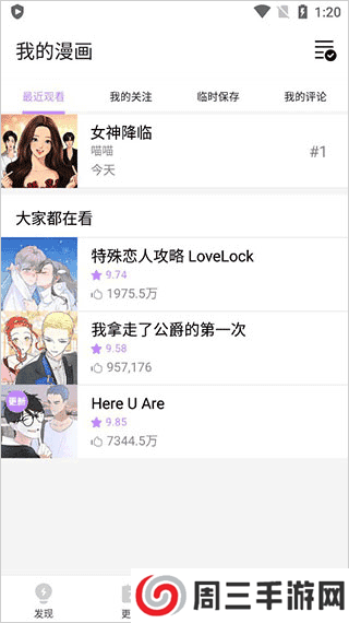 5、切换到我的漫画,可以看到我最近看的漫画,以及我的关注、临时保存、我的评论内容。