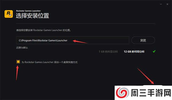 4、选择软件安装路径,默认安装地址为:【C:Program FilesRockstar GamesLauncher】并为自己创建一个桌面的快捷方式。