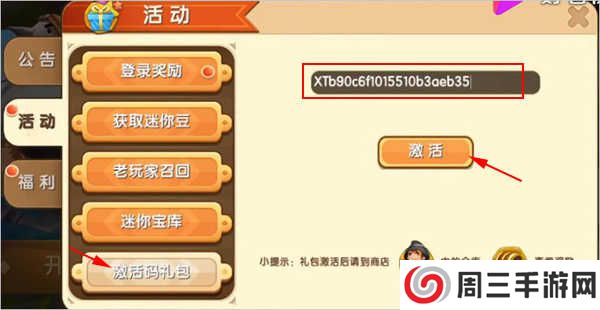 3、进入活动栏,点击活动码礼包,输入激活码,点击激活;