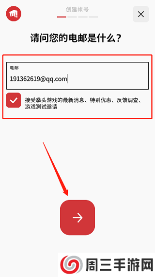 3、输入电子邮箱账号,勾选协议,点击下一步。