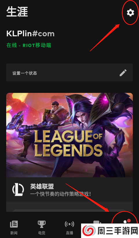 1、使用账号登录Riot Mobile手机版官方app后,点击【生涯】右上角的设置选项。