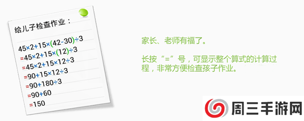 想查看计算步骤?非常简单,长按“=”号即可。很方便老师和家长检查作业,但一定要谨慎让孩子使用!