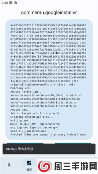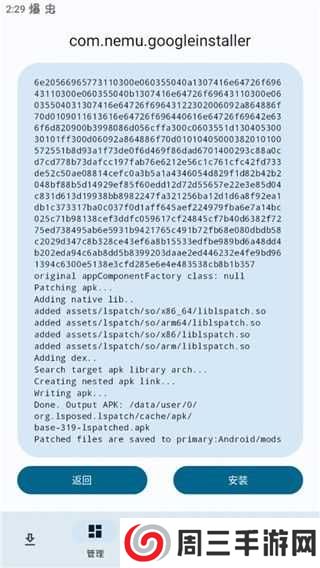 稍等片刻,待界面出现“done. output apk...”这样的信息时,表示已经修补完成。这时候不要点安装,即便点了也会提示shizuku服务未连接。我们直接点击“返回”按钮就可以了。