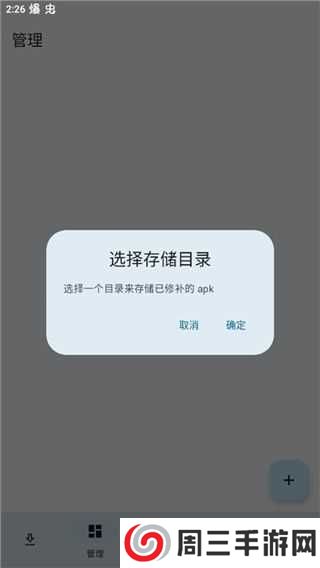 点击右下角的+号图标,然后会提示我们选择一个目录,用来存储修补后的apk文件。点击确定,选择一个你方便找到的目录文件夹,比如“pictures”、“downloads”等文件夹,也可以提前新建一个英文名字的文件夹。