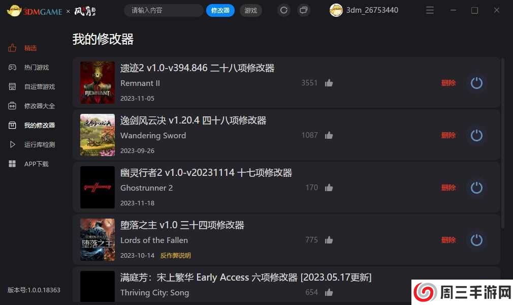 5、在我的修改器中能够快速找到已经下载的修改器资源,同时能够进行搜索、启动、删除等操作。
