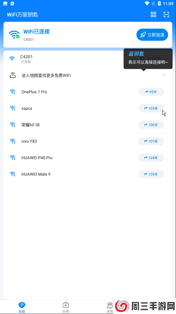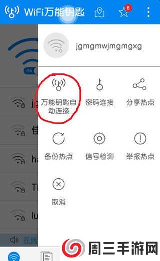 三.打开所有软件所需的权限后,在首页界面,打开wifi,看到wifi名称后有蓝钥匙的便可以点击自动解锁使用